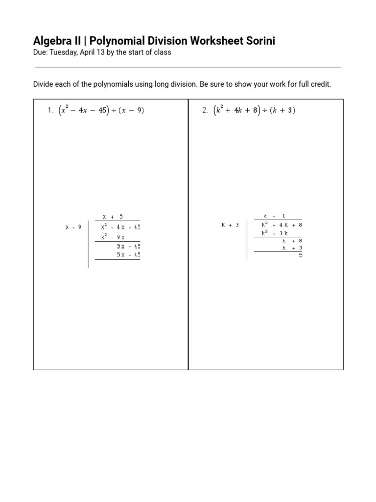 Algebra 2 Polynomial Long Division Worksheet Answers.